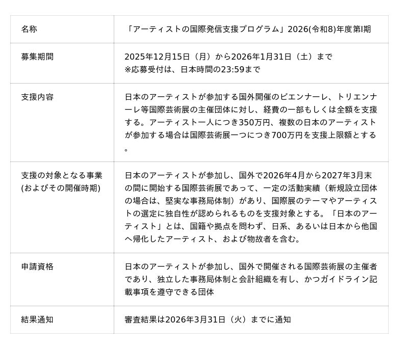 「アーティストの国際発信支援プログラム」2026(令和8)年度第I期 応募要項(概要)