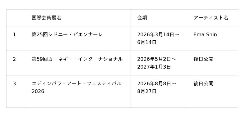 2025(令和7)年度の第I期募集においては、サンパウロ・ビエンナーレをはじめ6つの国際芸術展に、第II期募集においては、カーネギー・インターナショナルなどの3つの国際芸術展に参加する日本のアーティストへの支援が決定しました。