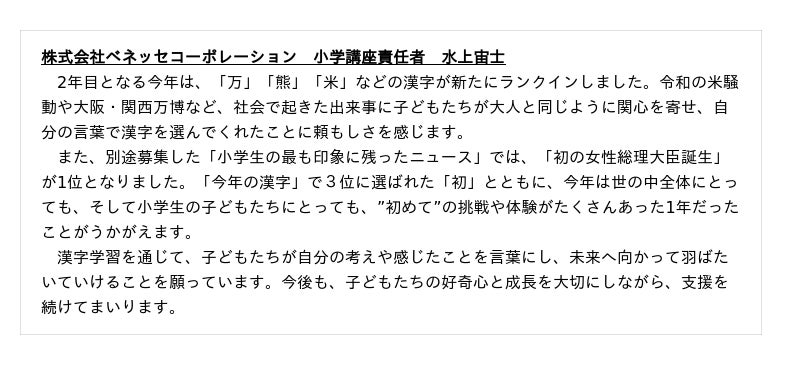 「進研ゼミ会員の小学生が選ぶ『今年の漢字』」の結果を受けて
