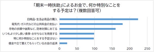 年末に支給される期末一時扶助については、「日用品・生活必需品」(44%)、「公共料金の支払い」(40%)、「防寒対策」(36%)が上位となり、生活維持に直結する用途が中心でした。「物価高で足りない」「特別なことには使えない」といった声も多く、年末の特別な出費より、日常生活を繋ぐために使われている実態が明確でした。
