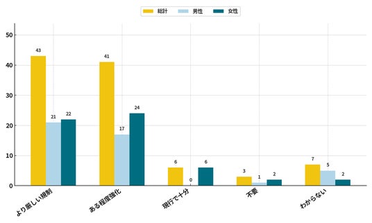回答では、「より厳しい規制が必要」(43%)、「ある程度の規制強化が必要」(41%)が圧倒的多数を占めました。一方で「現行の規制で十分」は6%、「規制は不要」は3%にとどまり、「わからない」は7%という結果でした。全体として、外国人による空き家取得に対して、自治体による規制を強化すべきだと考える意識が明確に表れています。
