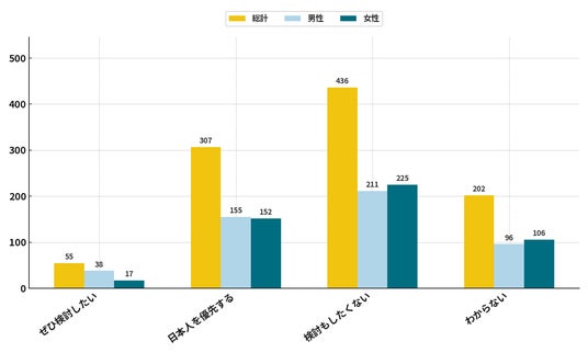回答では、「検討もしたくない」とする層が最も多く、43.6%に達しました。一方で「日本人を優先する」が30.7%、「わからない」が20.2%、「ぜひ検討したい」が5.5%という結果でした。全体として、明確な拒否が最多であり、前向きな受け入れよりも”条件付きの慎重姿勢”が主流であることが分かります。