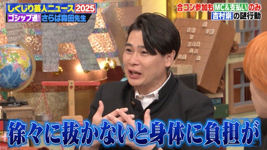 番組冒頭では、今年世間で注目を集めた芸人界のトピックをおさらいし、お笑いコンビ・平成ノブシコブシの吉村崇の“結婚ニュース”にも言及。森田先生が「結婚前はコンパだ、女の子だと言っていましたけど、もうそういうところには行ってないですか?」と問いかけると、吉村は「ちょっと距離は遠くなってる」「行ってないというか…」と言葉を濁します。ここでピン芸人・お見送り芸人しんいちが割って入り、「吉村さんは確かに結婚してからおとなしくなろうという意識がめっちゃ高くなりました」と前置きしながらも、「僕と東ブクロさん(さらば青春の光)でよくコンパしてます。それに吉村さんがMCしに来る」「(場を)回すだけ回して、金払って帰る」と暴露。「男性3女性3にプラス吉村さんなんで、何かが起きるのは0%」「空気だけ吸いに(来る)…」と続けたお見送り芸人しんいちに、吉村は「徐々に抜かないと身体に負担がかかるから」と語り、スタジオは爆笑となりました。