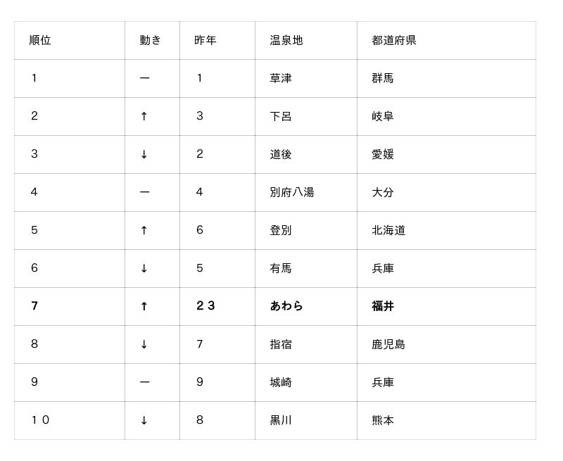 福井県あわら市の「あわら温泉」が第39回『にっぽんの温泉100選』(週刊観光経済新聞主催)で全国7位に選ばれました。このランキングは、旅行会社・鉄道・バス・旅客業など、旅行業界のプロによる投票で選ばれる信頼性の高いもの。今年の6月下旬より投票がはじまり、10月末まで投票を受け付けており、最終結果が12月15日に観光経済新聞の紙面上で発表されました。中間発表では6位でしたが、最終結果は7位となり、昨年の23位から大きく順位を上げる快挙です。