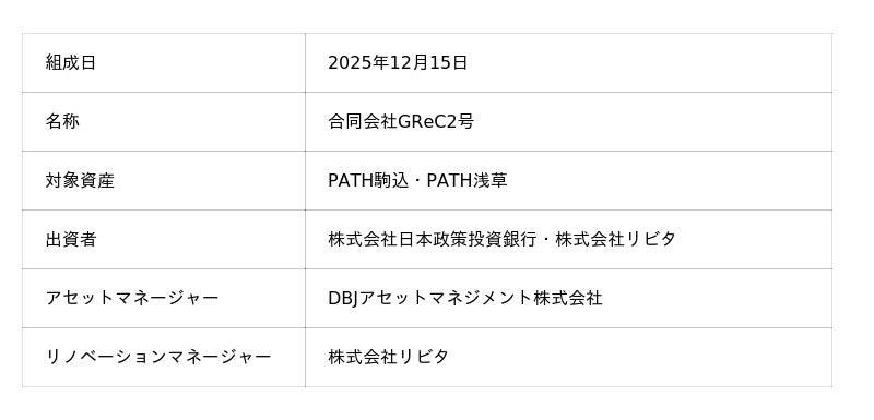 株式会社リビタ(本社:東京都目黒区、代表取締役社長:長谷川和憲、以下「リビタ」)、株式会社日本政策投資銀行(本社︓東京都千代田区、代表取締役社長︓地下誠二、以下「DBJ」)およびDBJアセットマネジメント株式会社(本社:東京都千代田区、代表取締役社長:窪田昌一郎、以下「DBJAM」)は、環境配慮型リノベーションファンドの第2号ファンド(以下「当ファンド」)を2025年12月15日(月)に組成し、運用を開始しました。