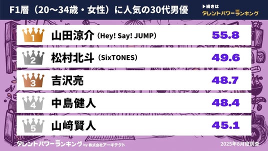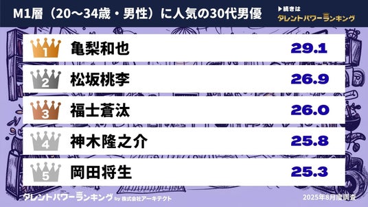 『タレントパワーランキング』では、タレントパワーランキングに登録されている30代男優について、M1層(20~34歳男性)とF1層(20~34歳女性)が回答した、それぞれの結果を調査。
