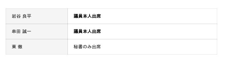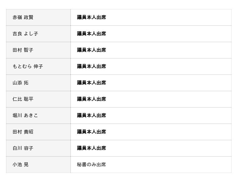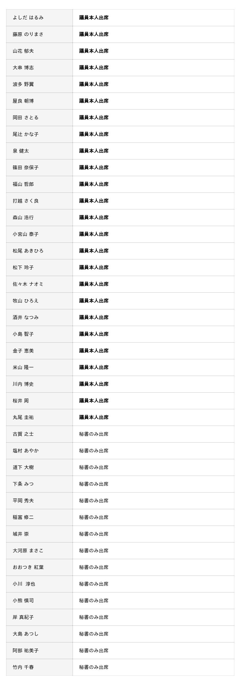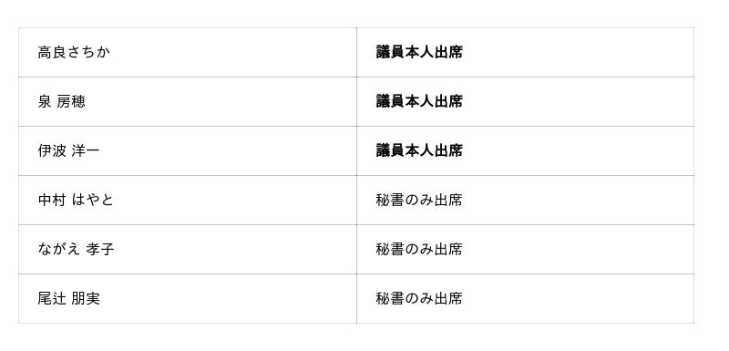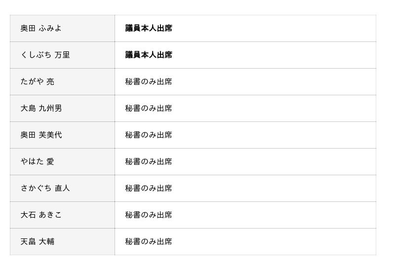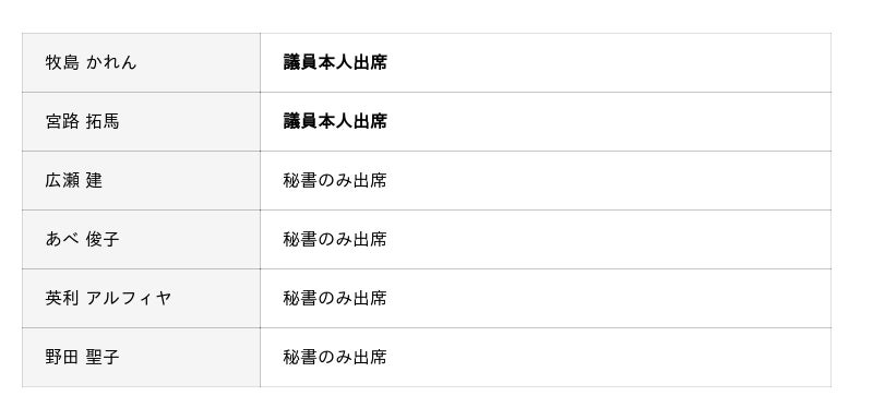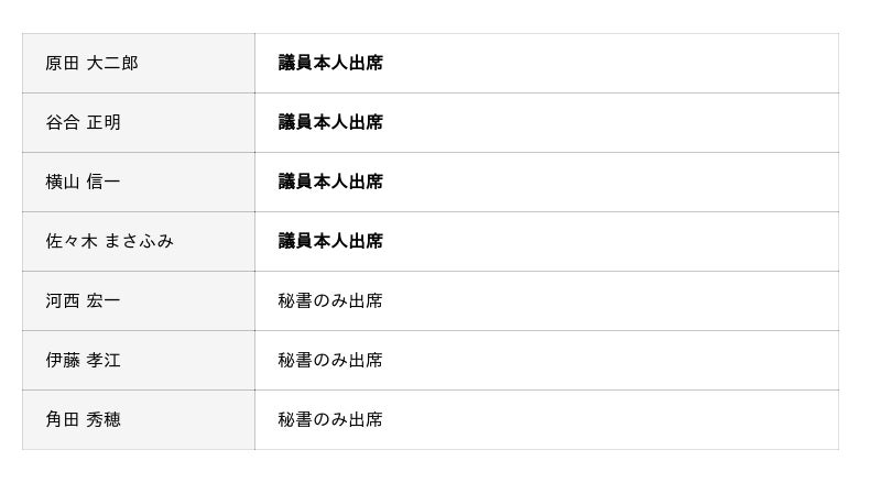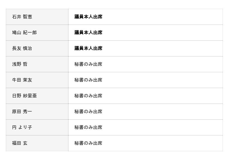 ・合計95名(議員本人:54名、秘書のみ:41名)・自由民主党 6名(議員本人:2名)