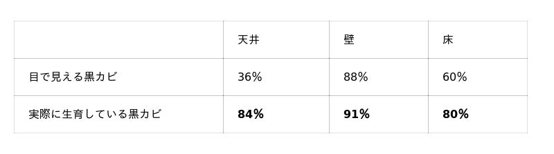 サンプル箇所の内、黒カビを目視で観察し、サンプル箇所全体における「目で見えている黒カビ」の割合を算出。