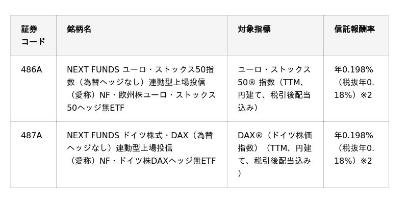 野村AM、NEXT FUNDS ユーロ・ストックス50指数(為替ヘッジなし)連動型上場投信、NEXT FUNDS ドイツ株式・DAX(為替ヘッジなし)連動型上場投信を新規上場