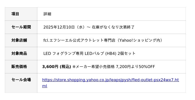 車・バイク用カスタムパーツ専門店エフシーエル(fcl.)を展開する株式会社WiNEEDS HOLDINGS(所在地:広島市南区、代表取締役社長:尾田 雅史)は、新モデルへの移行に伴い、人気の「LEDフォグランプ専用バルブ(HB4)」をメーカー希望小売価格の50%OFFで提供するアウトレットセールを、2025年12月10日(水)よりfcl.エフシーエル公式アウトレット専門店にて開始します。