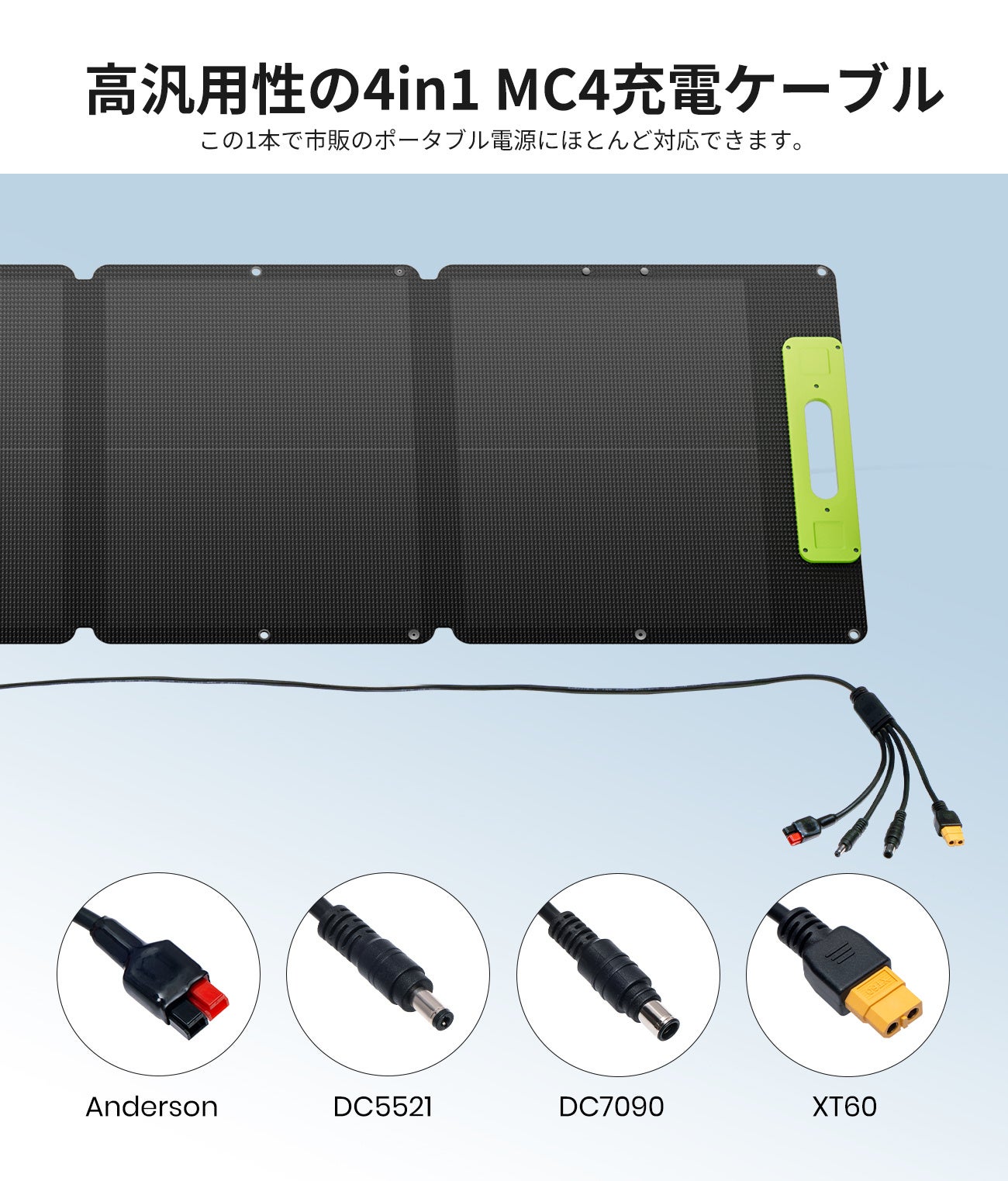 USBポートを標準装備し、ポータブル電源だけでなく、スマートフォンやタブレットなどへの直接充電が可能。付属の「4in1 MC4充電ケーブル」は、市販のほとんどのポータブル電源に接続できる高汎用性設計です。
