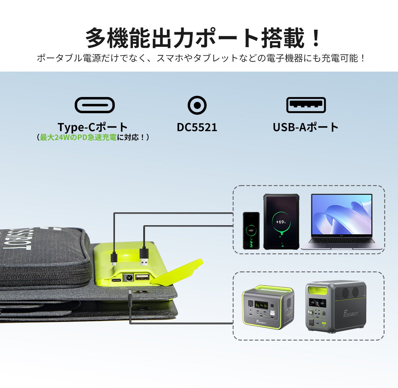 ■ 幅広い機器への直接充電を可能にする多機能ポート