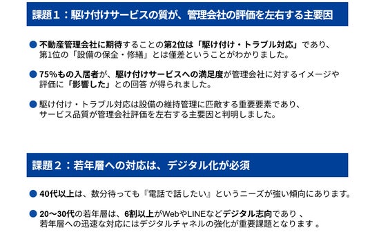 今回の調査により、不動産管理会社に対する評価が、駆け付けサービスの満足度に大きく左右されること、そしてサービス品質において「すぐに駆け付けてくれるスピード」と「技術力の高さ」が、入居者から最も強く求められることが判明いたしました。トラブル発生時の受付では、40代以上は電話ニーズが強い一方、20~30代はデジタルチャネルを望むという、世代間の二極化も明確になりました。