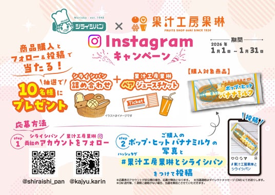 また、発売を記念し、『ポップ・ヒット バナナミルク』を購入のうえ、Instagram公式アカウントをフォローし投稿いただいた方の中から抽選で10名様に、シライシパンの商品詰め合わせと果汁工房果琳のペアジュースチケットが当たるキャンペーンを、2026年1月1日(木)から2026年1月31日(土)まで実施いたします。