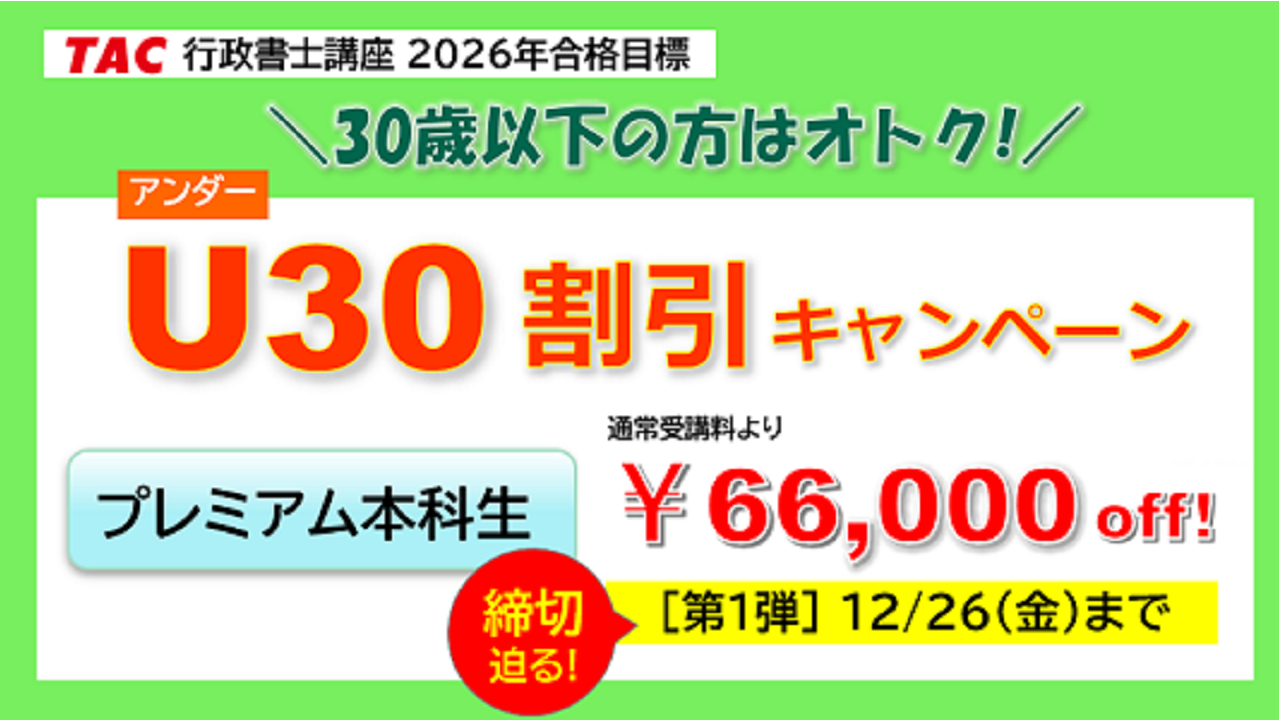 https://www.tac-school.co.jp/kouza_gyosei/gyosei_hayawaricp.html2026年合格目標『U30割引キャンペーン第1弾』