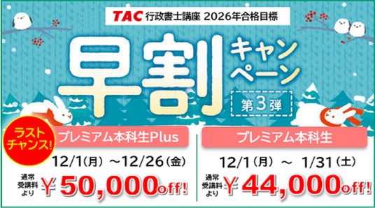 行政書士試験対策講座を展開しているTAC株式会社(東京都千代田区、代表取締役:多田敏男)は、行政書士試験の学習がはじめての方を対象にした割引キャンペーンを12/26(金)まで実施中。初学者の方もオトクに学習スタートするチャンスです!
