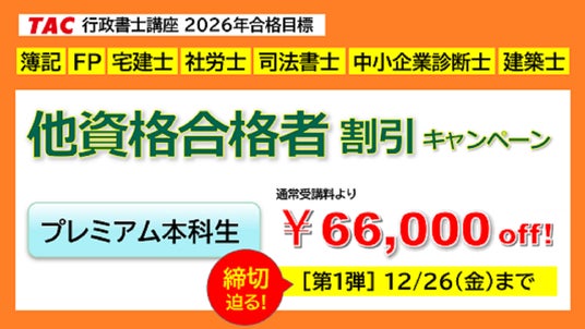 https://www.tac-school.co.jp/kouza_gyosei/gyosei_u30cp.html2026年合格目標『他資格合格者割引キャンペーン第1弾』