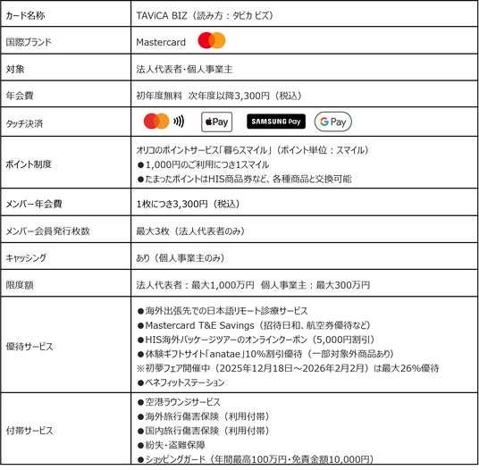 株式会社エイチ・アイ・エス(本社:東京都港区 以下、「HIS」)は、株式会社オリエントコーポレーションとの提携ビジネスカードである「SKY BIZ」をリブランディングし、「TAViCA BIZ」としてカードデザインを一新するとともに優待サービスおよび付帯サービスを追加し、2025年12月19日(金)より新サービスを開始いたします。