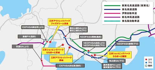 以下、対象施設(4施設)とNEXCO中日本管内の対象SA・PA(13施設)によるキャンペーンとなります。期間中NEXCO中日本管内の対象SA・PAのお買い上げレシートと三井ショッピングパークポイント会員ページ「メンバーズページ」登録画面を各施設の引換カウンターに提示すると、施設で使用できるお買物券やスペシャルクーポンをプレゼントします。【対象施設】