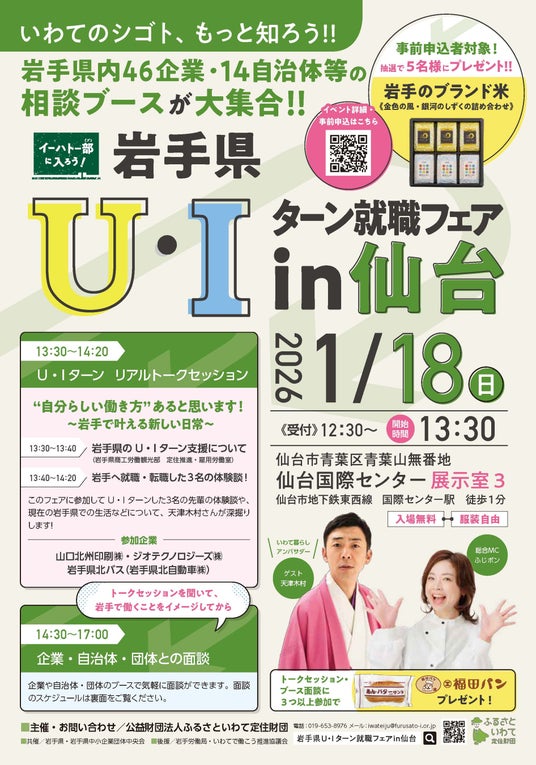 会場では、県内企業46社や自治体等14団体に就職や移住について対面相談ができるほか、いわて暮らしアンバサダー天津木村さんをゲストに、岩手県に就職・転職した方のリアルな体験談を発信するトーク形式のセミナーを実施します。