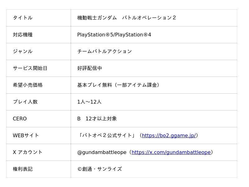 株式会社バンダイナムコエンターテインメントは、PlayStation(R)5/PlayStation(R)4向けオンライン専用ゲーム『機動戦士ガンダム バトルオペレーション2』 (以下、『バトオペ2』)にて、