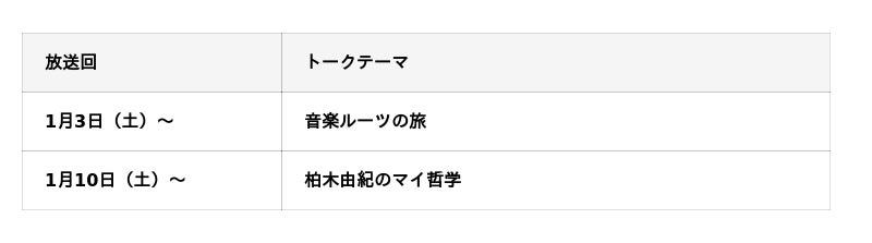 1週目「音楽ルーツの旅」では、柏木由紀さんがRyo’LEFTY’Miyataとソロコンサートで初共演して以降、仕事仲間として信頼関係を築いてきたエピソードをはじめ、アイドルを志すきっかけとなった原点について紹介します。2週目「柏木由紀のマイ哲学」では、母親から贈られた言葉を支えに彼女独自の哲学が育まれていった経緯を紹介。あわせて、毎日湯船に浸かる習慣など、飾らない私生活のこだわりも語られます。