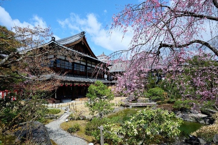 「都をどり」の舞台は、国指定登録有形文化財で祇園町のシンボルである「祇園甲部歌舞練場」です。2023年に令和の大改修を終え、建設当初の姿を残しながらも、最新の設備を取り入れた観劇の場を提供しています。折上格天井や両花道など当初の趣はそのまま、歴史を感じることが出来る設えです。また併設された八坂俱楽部の庭園では2024年に経年変化からの修復作業を行い、明るく日が差し込む風情ある庭園がよみがえりました。四季の移り変わりを楽しめる庭園で、「都をどり」の時期には桜が咲き誇り、雅な空間と非日常感を味わうことができます。
