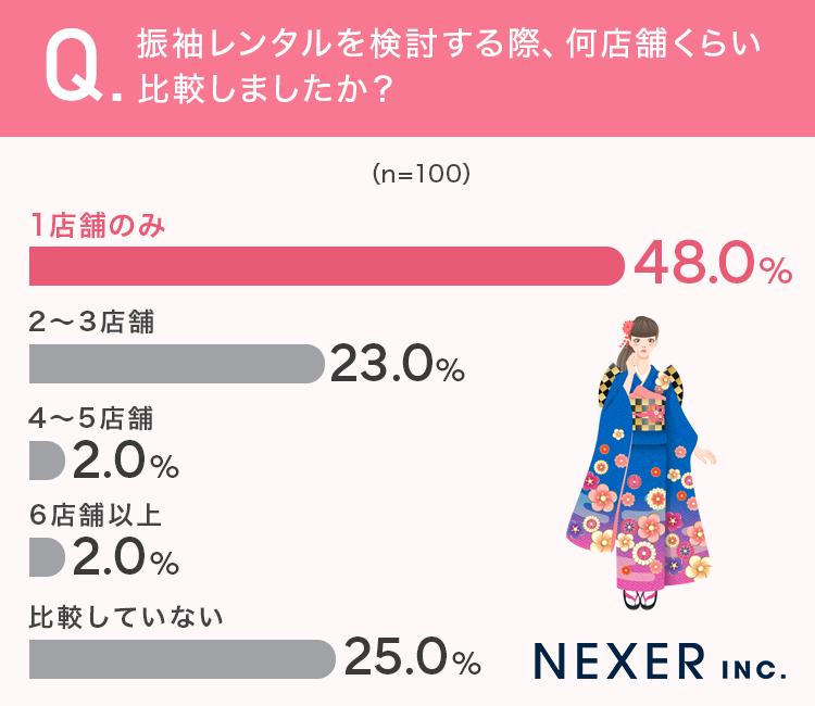 振袖レンタル検討者の約半数48%が「1店舗のみ」で決定しており、比較検討を行わない傾向が強いことが分かりました。