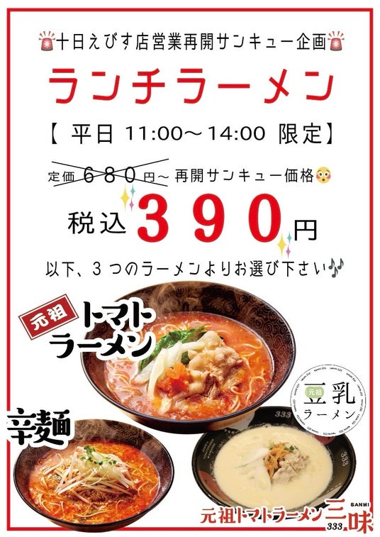 ■平日ランチ限定「390円(税込)」ラーメン 日頃の感謝を込め、三味(333) 十日えびす店は平日11:00~14:00限定で、元祖トマトラーメン・味噌辛麺・元祖豆乳ラーメンの3種を「サンキュー価格」の390円(税込)で提供中です。