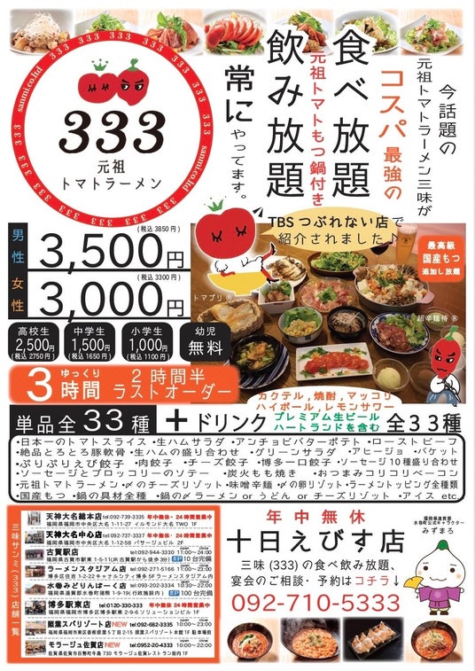 【福岡・博多の新名物】元祖トマトラーメン三味(333)十日えびす店、1月7日~11日の「正月大祭」期間中に24時間営業を実施!