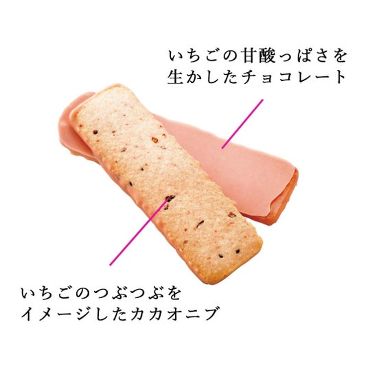 いちごの甘酸っぱさが存分に楽しめるバトンクッキー。いちごが香る生地の片面に、いちごの甘酸っぱさを生かしたチョコレートをコーティング。生地にはカカオニブを入れ食感のアクセントもプラスして、見た目もまるでいちごのように!"いちごの果実そのもの"をイメージした、いちごづくしの1枚です。