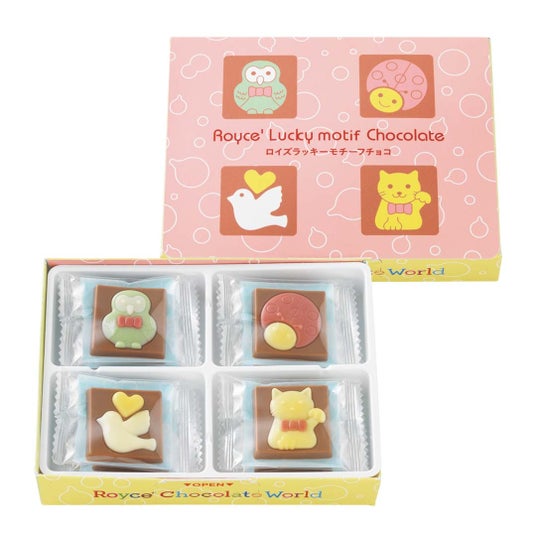 幸運の象徴とされる4つの生き物やアイテムをモチーフにしたひと口サイズのチョコレート。ストロベリー風味のクリームをまろやかなミルクチョコレートで包み、フクロウ・てんとうむし・ハト・招き猫の4種をデザインしました。通常は新千歳空港3階の「ロイズ チョコレートワールド」限定販売ですが、期間限定で公式オンラインショップでも販売します。