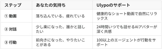 Ulypoは、「ショート動画でリラックス → AIとの対話で共感 → エージェントで行動へ」という3つのステップで、心と行動の両面を統合的にサポートします。