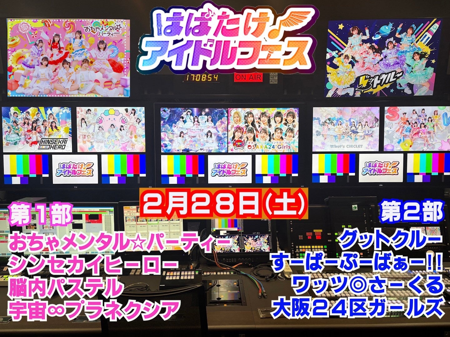 「はばたけ!アイドルフェスINテレビ大阪」初出演のアイドルは3組。大阪のアイドルシーンには欠かせないグループ「大阪24区ガールズ」と「ワッツ◎さーくる」が満を持して登場!そしてまだデビューして1年満たない新人アイドル「宇宙∞プラネクシア」が大抜擢!前回会場を賑わせた脳内パステルやシンセカイヒーローなども連続して出場します。このライブと企画コーナーの一部はテレビ大阪で放送、TVerでも配信予定です。