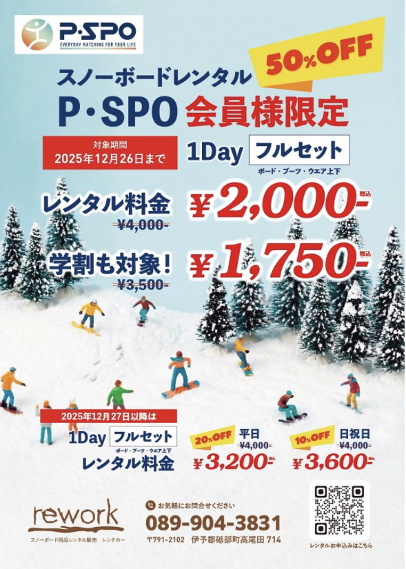 愛媛・砥部町 rework|P・SPO会員限定「スノーボード1日レンタルMAX50%OFF」キャンペーンを実施