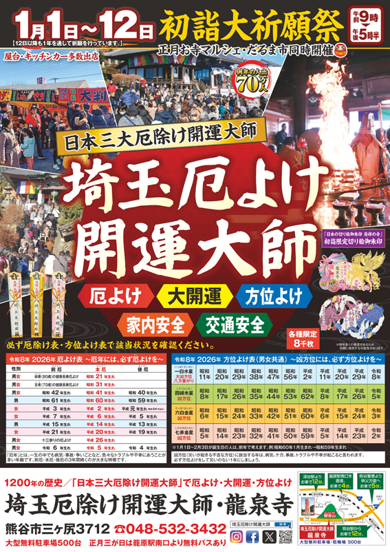 初詣|日本三大厄除け開運大師の一つ埼玉厄除け開運大師・龍泉寺にて令和8年1月1日より初詣大祈願祈祭を開催
